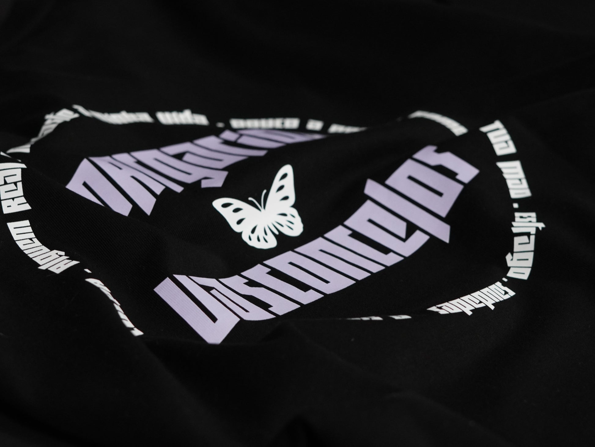 T-shirt oversized, 100% algodão, disponível na cor preta, com design moderno e exclusivo, esta t-shirt apresenta estampagem em branco e roxo, incorporando elementos gráficos e referências a títulos de algumas das músicas da artista, dando-lhe uma identidade única e contemporânea.